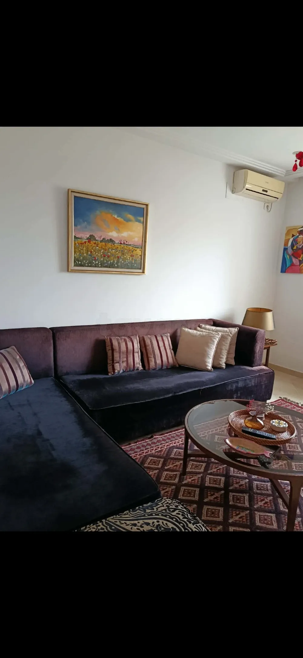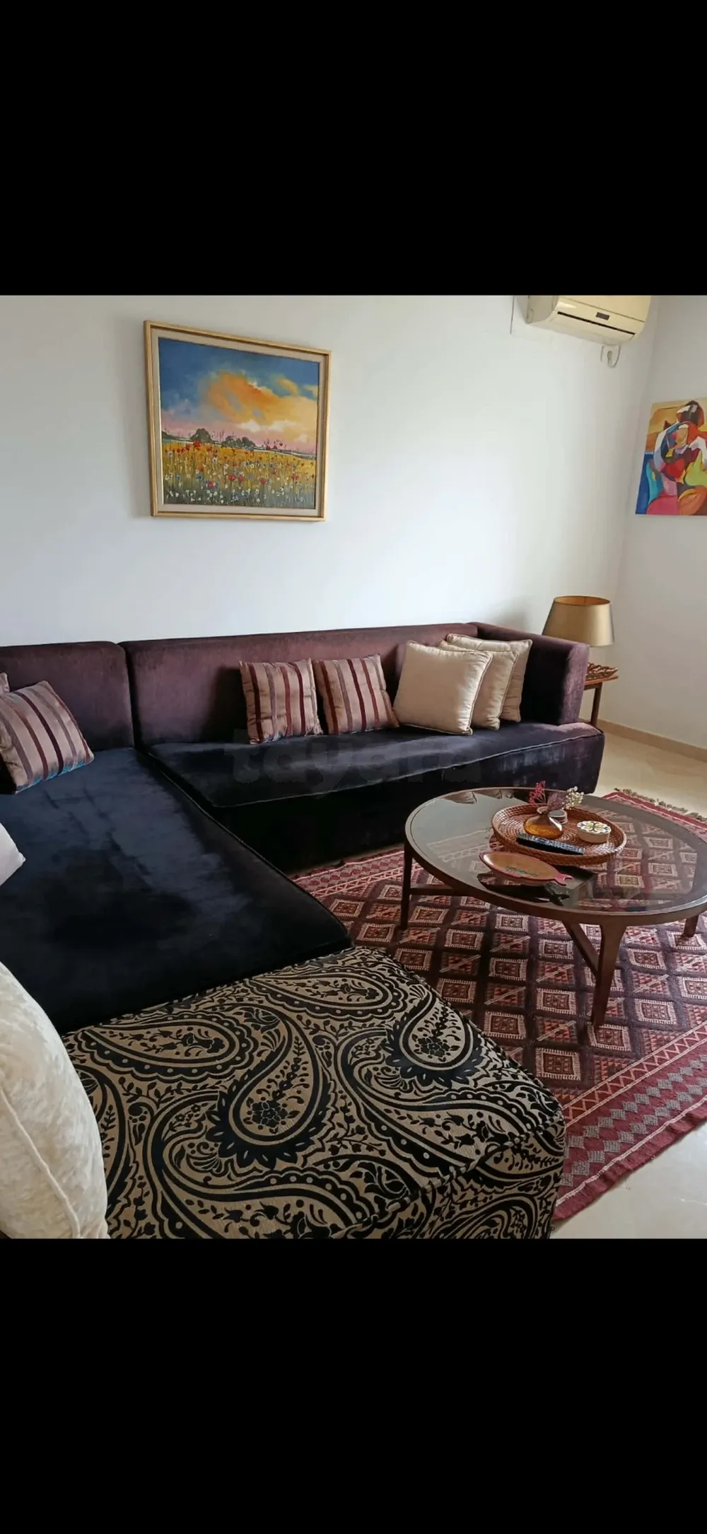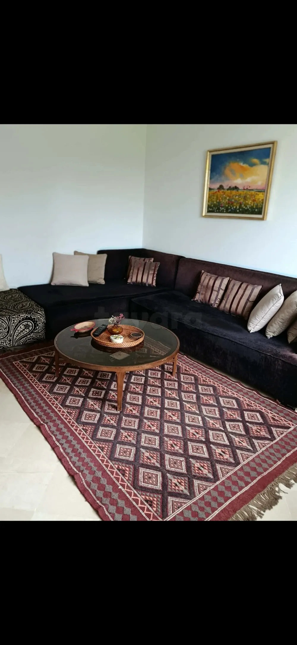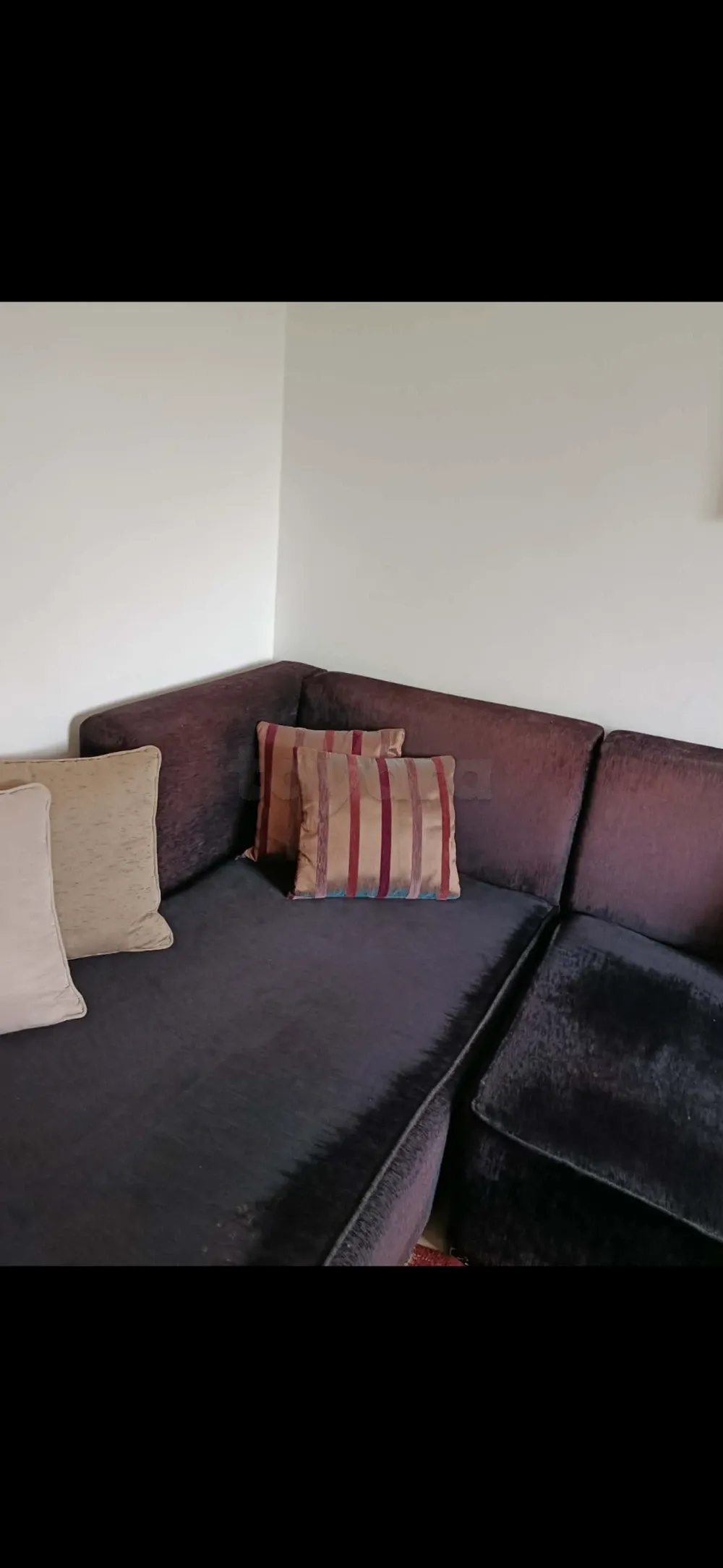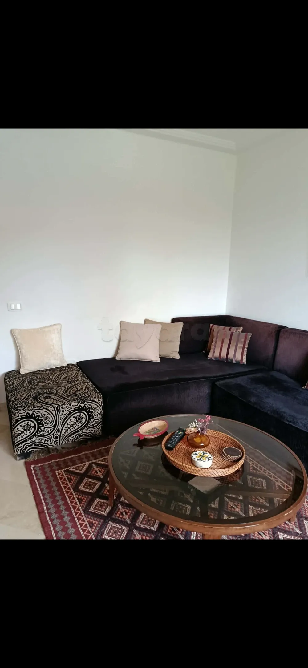 Canapé en forme angle L pour salon ou bit kaad. Vient avec un pouf