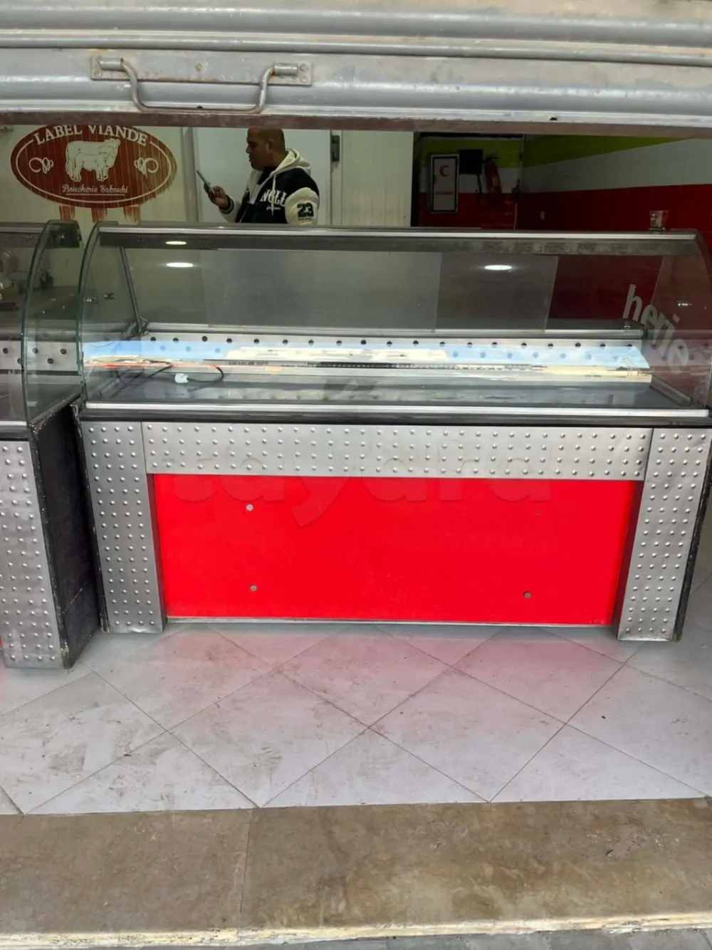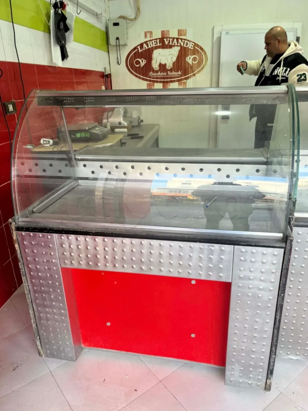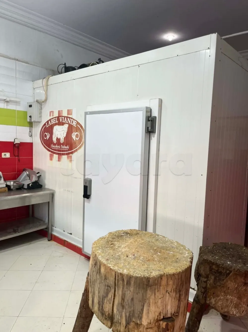Matériel Boucherie, chambre froide 4m/1,5m , table inox alimentaire deux étages 3 m . hachoir de viande 32 . puce-oir merguez . Trancheuses salami . deux vitrines 2,2m + 1m . 9ardha bonda9 . Bascule Dibal