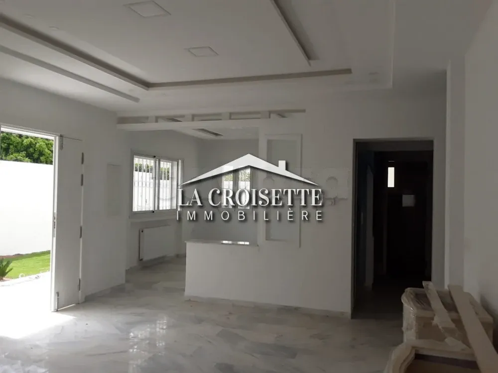 La Croisette Immobilière Tunisie vous propose à la location un étage de villa neuf en S+2, occupant le rez-de-chaussée, situé aux Jardins de Carthage. Ce dernier se compose d'un grand salon salle à manger, d'une salle d'eau d'invités, d'une cuisine bien équipée attenante, de deux chambres à coucher avec dressing, d’une salle de douche.