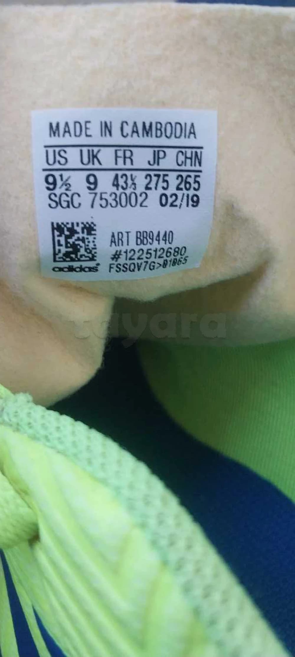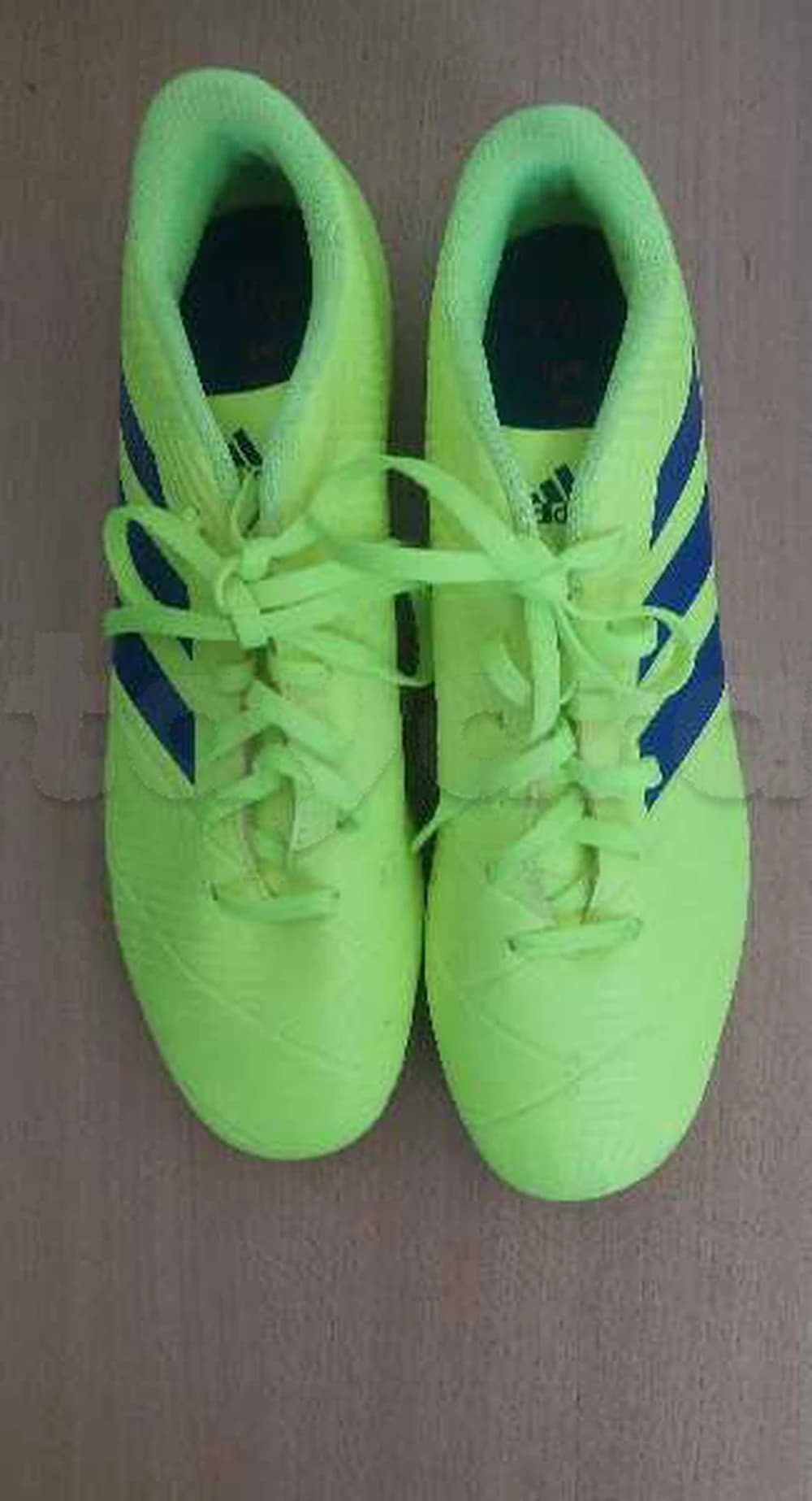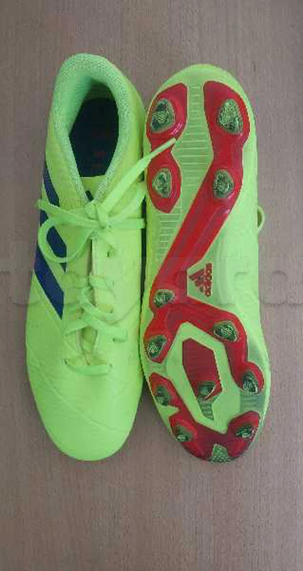À vendre chaussures de foot Adidas originales, couleur vert fluo avec bandes bleu marine, idéales pour se démarquer sur le terrain ✨