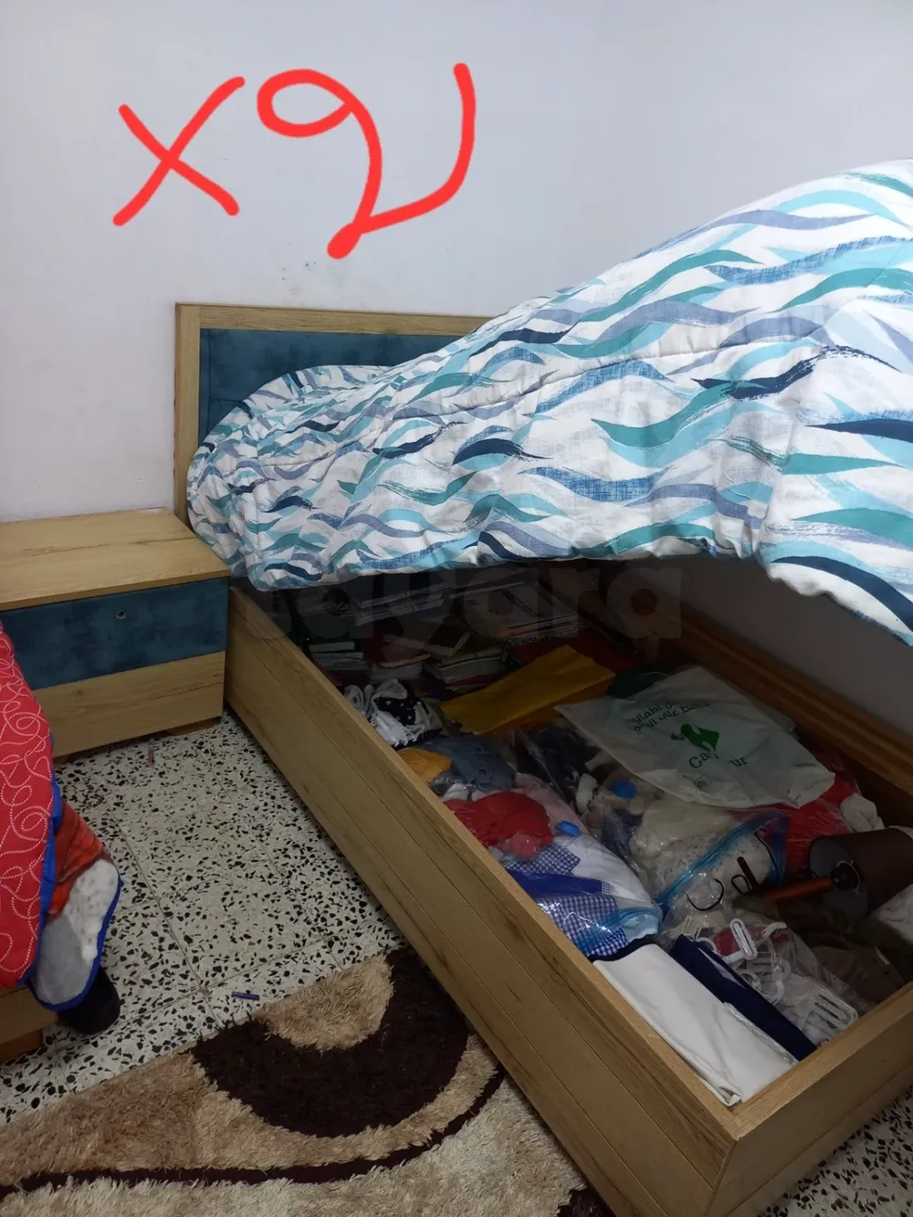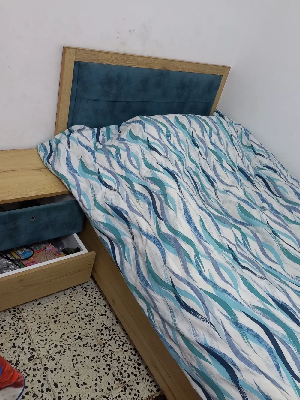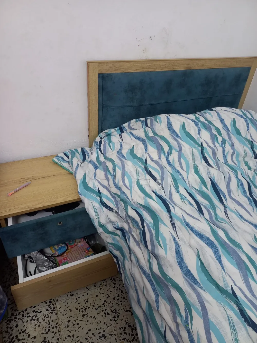 2 lits enfants avec coffre de rangement place et demi 120×200, tête de lit capitonné en bleu+ 2 table de nuit rn bonne état. (Sans matelas)