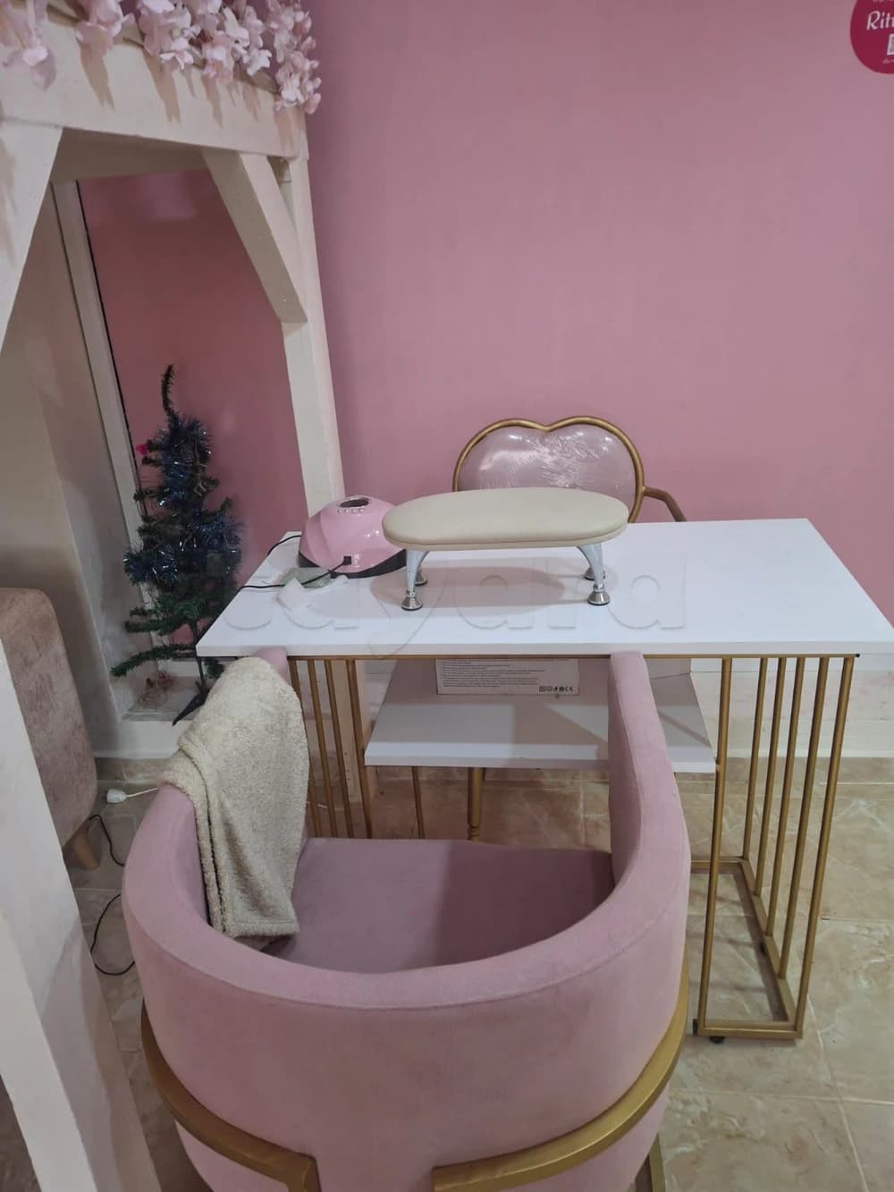 Le salon est composé d’une zone pour onglerie et esthétique avec 2 postes et d’une une zone séparée pour soins. Le salon est aussi équipé, d’un divan, d’une caisse, d’un chariot, de présentoirs et étagères pour produits et d’une table.