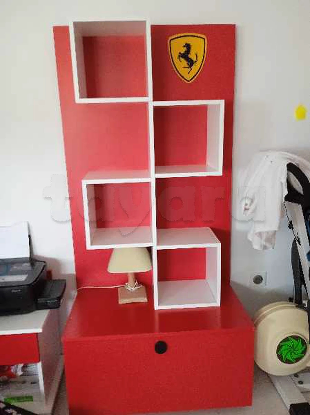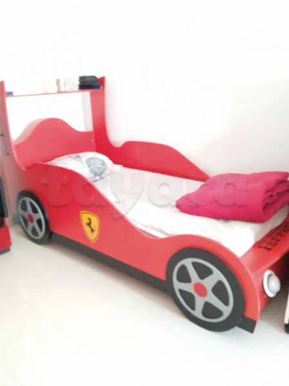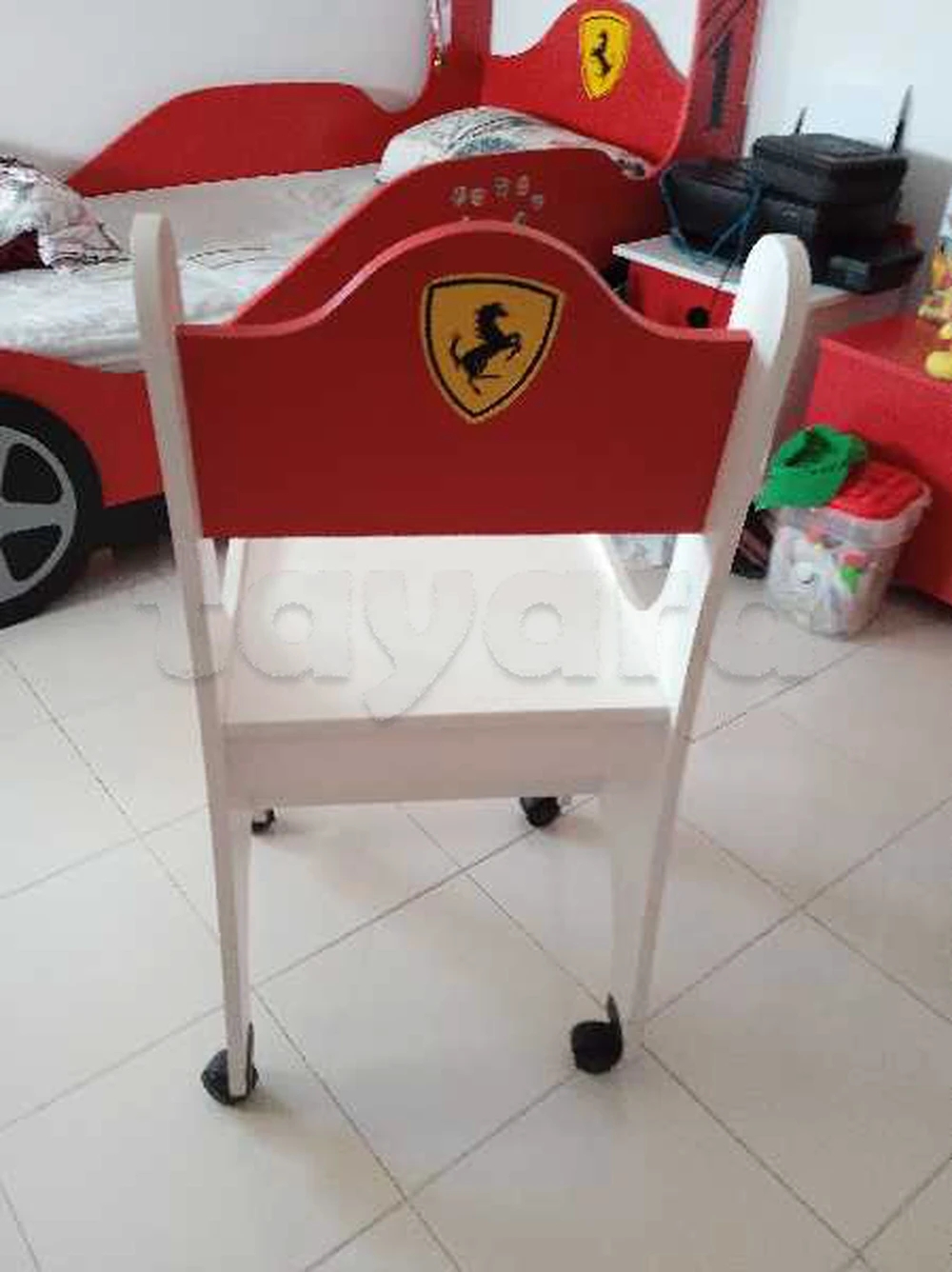 un lits et une armoire et un bureau avec une chaise de thème Ferrari