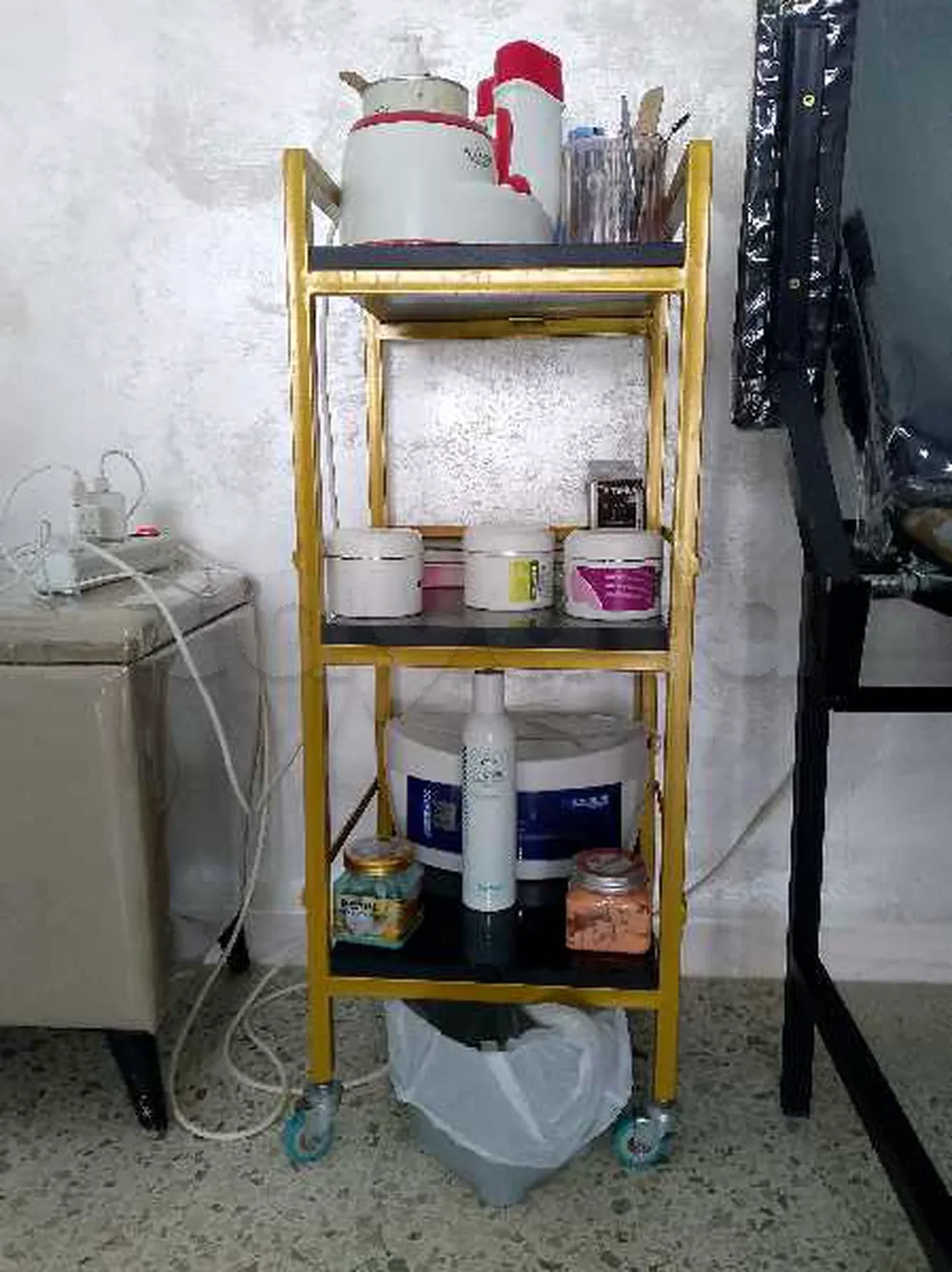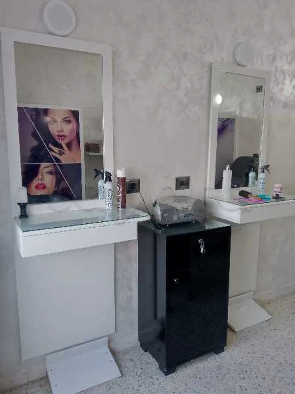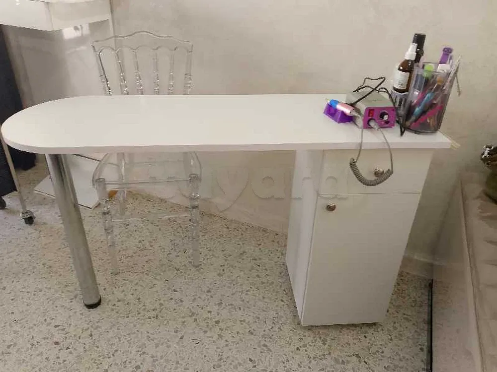 2 miroirs+ 2 chaises pour salon de coiffure+ un dossier+ une table pour onglerie+ un support caisse en très bon état