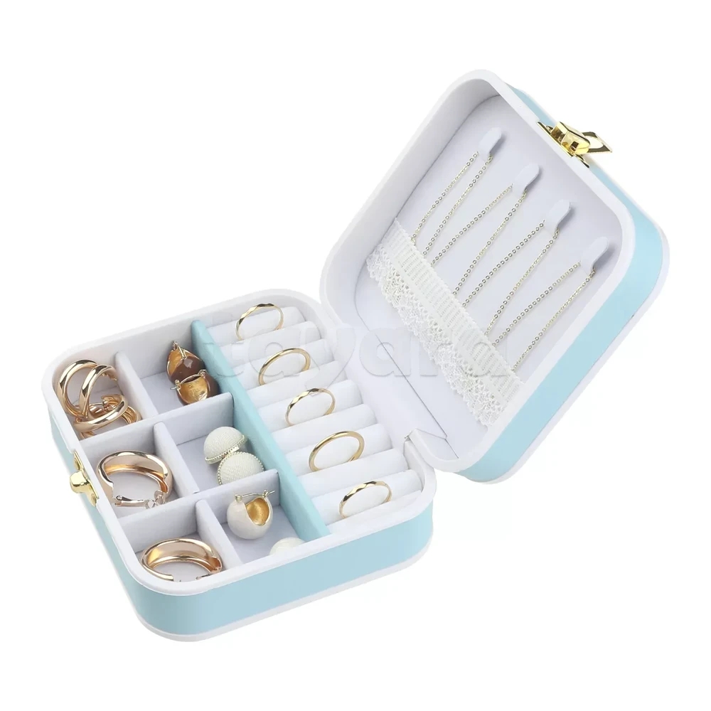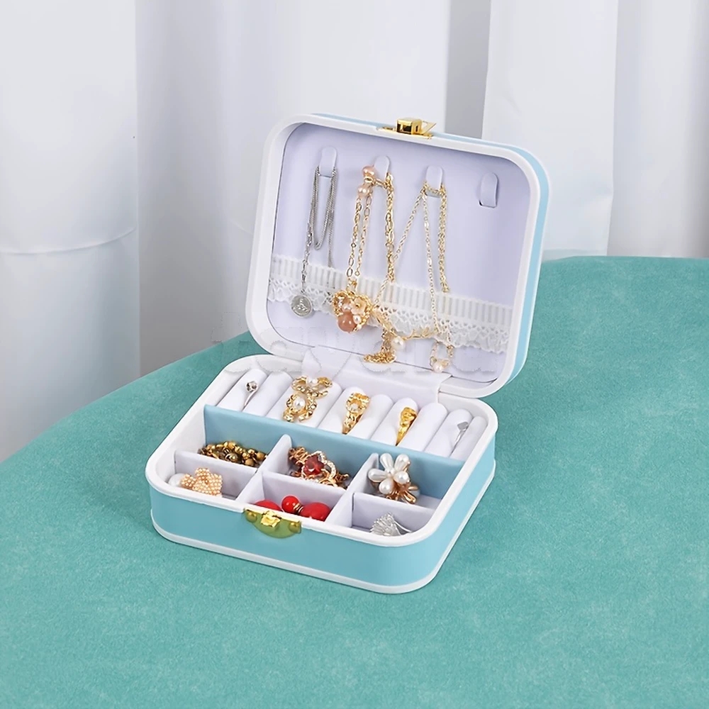 une boîte à bijoux portable en cuir PU avec un intérieur en velours.